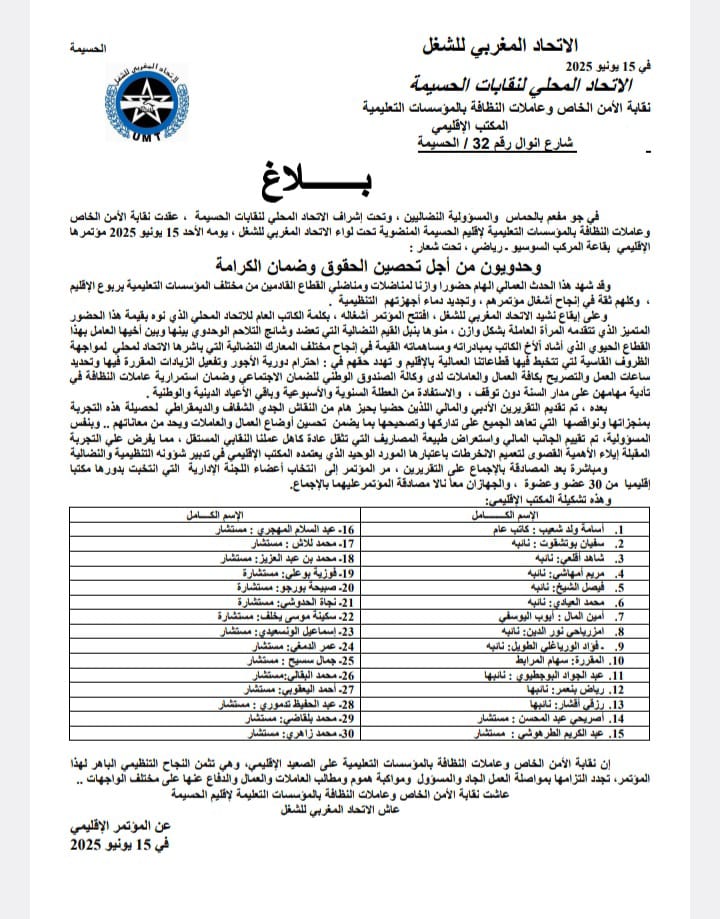 نقابة الأمن الحاص وعاملات النظافة بالمؤسسات التعليمية تعقد مؤتمرها الإقليمي بالحسيمة