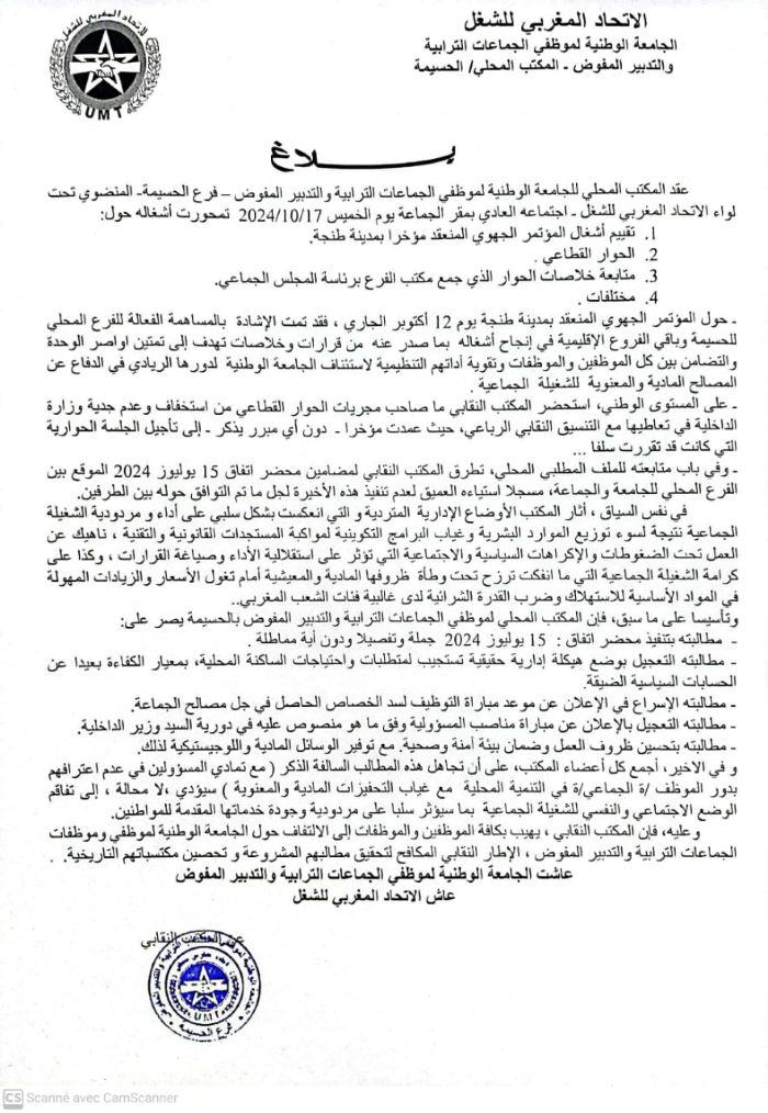 وتأسيسا على ما سبق، فإن المكتب المحلي لموظفي الجماعات الترابية والتدبير المفوض بالحسيمة يصر على: